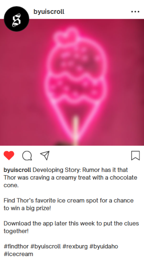 I worked on the marketing team for the launch of Scroll’s new app. Scroll is BYU-I’s news organization and was founded in 1905. My job was to create part of a campaign for the app launch. The picture is a mockup post of what one of the final posts will look like. To learn more, please click on the picture.
