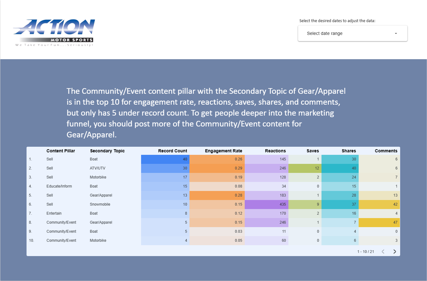 I worked for Action Motor Sports to analyze their data from their Facebook account. I took the exported information and filled in the missing data, to then put in to Looker Studio. This is an opportunity that I found that they could market off of.